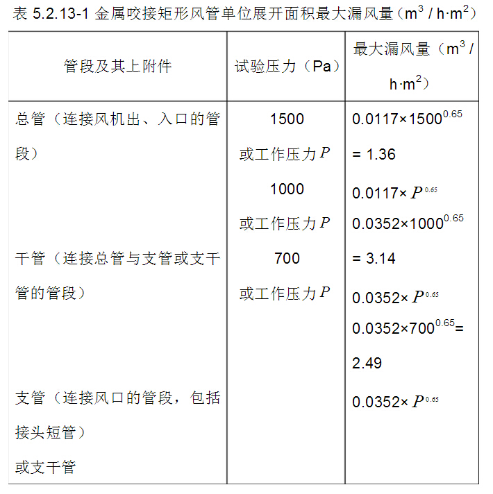 單位風管展開面積漏風量應符合表5.2.13-1的規(guī)定。