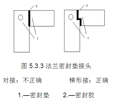 5.2.21當用于5級和高于5級潔凈度級別場合時,角鋼法蘭上的螺栓孔和管件上的鉚釘孔孔距均不應大于65mm,5級以下時不應大于100mm。薄壁法蘭彈簧夾間距不應大于100mm,頂絲卡間距不應大于100mm。矩形法蘭四角應設螺栓孔,法蘭拼角縫應避開螺栓孔。螺栓、螺母、墊片和鉚釘應鍍鋅。如必須使用抽芯鉚釘,不得使用端頭未封閉的產(chǎn)品,并應在端頭膠封。